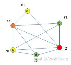 基于着色图分配寄存器的过程就是将不同颜色对应不同物理寄存器,颜色数量k对应物理寄存器数量。在本例中,通过图着色方法可以为六个变量(a-f)分配四个寄存器(r0-r3)而不产生冲突,如下图所示。当然,寄存器分配比较复杂,不仅仅是图着色的问题。比如,当物理寄存器数目不足以分配给所有变量时,就必须将某些变量溢出到内存中,即spill。最小化溢出代价的问题,也是一个NP-complete问题。