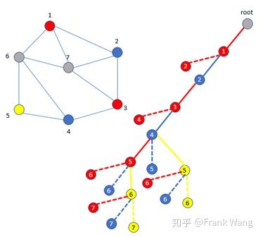 5. 对节点7不能再用红色、蓝色和黄色,因为节点7与节点1、2、3、6都关联,无论用红色、蓝色或黄色都会与其它节点冲突。因为本例中限制颜色数量为3,因此节点7无法再着色。